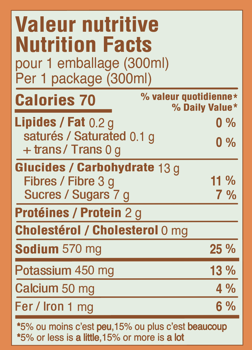Ingrédients : Eau, Tomates en dés (tomates, jus de tomates, chlorure de calcium, acide citrique), Carotte, Oignon, Navet, Céleri, Chou, Haricot vert ou jaune, Sauce chili (purée de tomates, vinaigre blanc, eau, sucre, sel, oignon déshydraté, épices, poudre d’ail), Pâte de tomates, Sel, Poudre d’ail, Origan, Poudre d’oignon, Poivre, Persil, Thym.